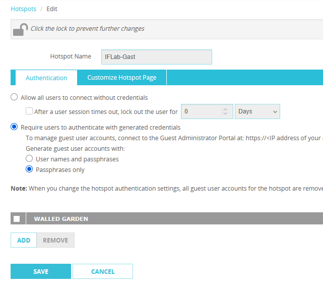 Hier (unter Authentication) kann konfiguriert werden, ob und wenn ja wie man sich am Hotspot anmelden muss. Ich habe mich hier für “nur Kennwort” entschieden.