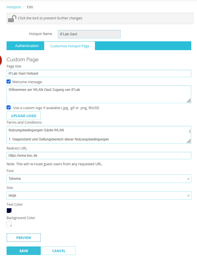 Auf der Folgeseite (Customize Hotspot Page) kann die Hotspot Landing Page konfiguriert werden