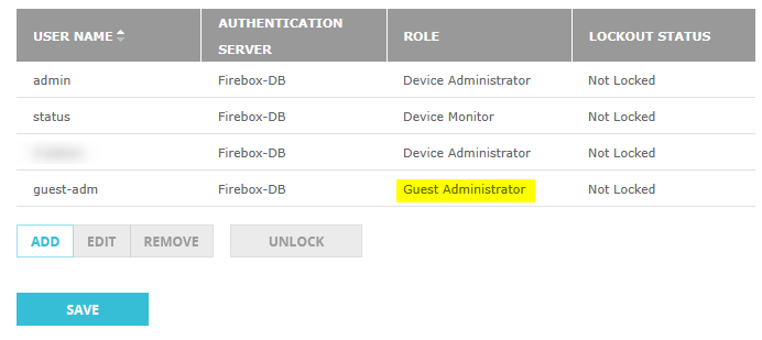 In der WebUI unter System -> User and Roles wird die Benutzerverwaltung der Firewall-Administrationsbenutzer aufgerufen (nicht zu verwechseln mit den Benutzern/Gruppen, die für Authentication, VPN-Login etc. verwendet werden). Dort wird ein Benutzer mit Rolle Guest Administrator angelegt. Dieser Schritt ist notwendig, um Tickets zu erzeugen, einzusehen und drucken zu können. Dieser User eignet sich beispielsweise für Mitarbeiter am Info-Point/Empfang/Rezeption etc.