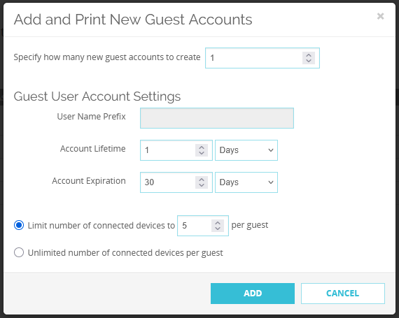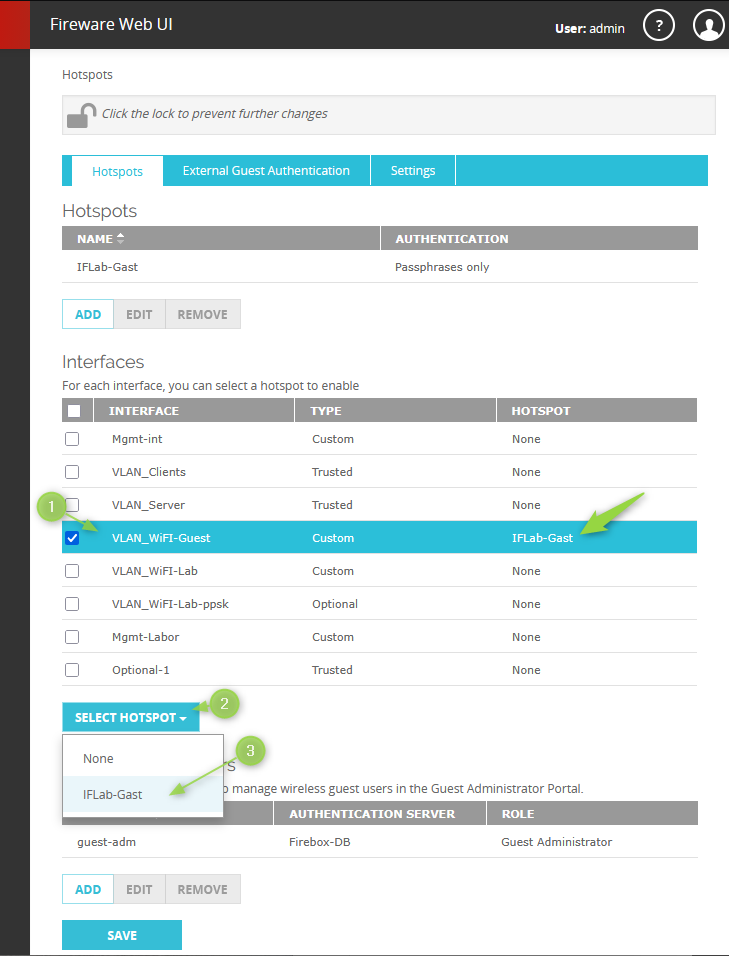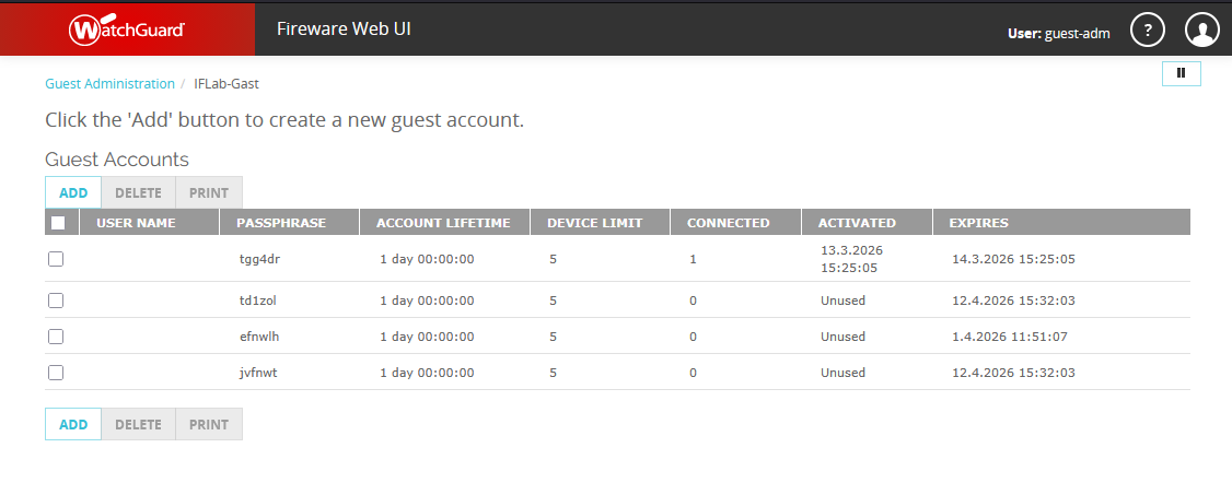 Unter der Web-UI der Firebox unter https://<firewall-ip>:8080 kann man sich als Gast Administrator einloggen. Dort kann man nun den gewünschten Hotspot auswählen, und mit ADD neue Tickets hinzufügen.