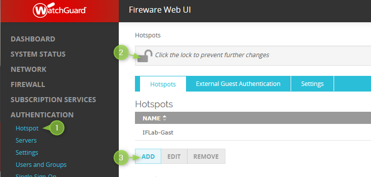 In der WebUI der Firewall unter Authentication > Hotspot … wird der Hotspot eingerichtet. Zunächst wird mit einem Klick auf Add ein Hotspot hinzugefügt (WatchGuard unterstützt seit fireware 11.11 mehrere Hotspots mit unterschiedlichen Authentifizierungsverfahren/Freigaben für unterschiedliche Interfaces – vor 11.11 ist nur ein Hotspot verfügbar).