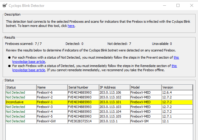 - Starten Sie den Cyclops Blink Detector unter Tools => Cyclops Blink Detektor und geben Sie die Credentials für die Firewall ein. Starten Sie den Check. Sie sollten folgendes sehen: