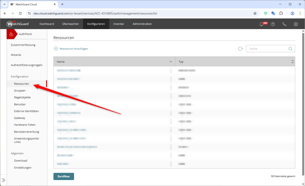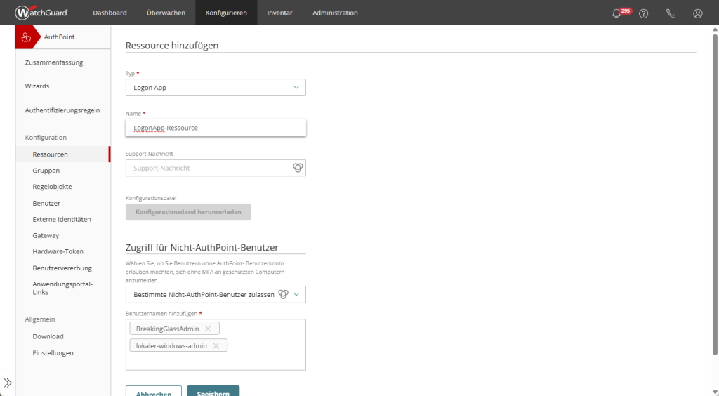 Der erste Schritt in der WatchGuard Cloud ist das Anlegen einer Ressource für die Logon App. Dazu im TOP-Menü Konfigurieren -> AuthPoint -> Ressourcen den Button „Ressource hinzufügen“ wählen und die entsprechenden Daten eintragen: