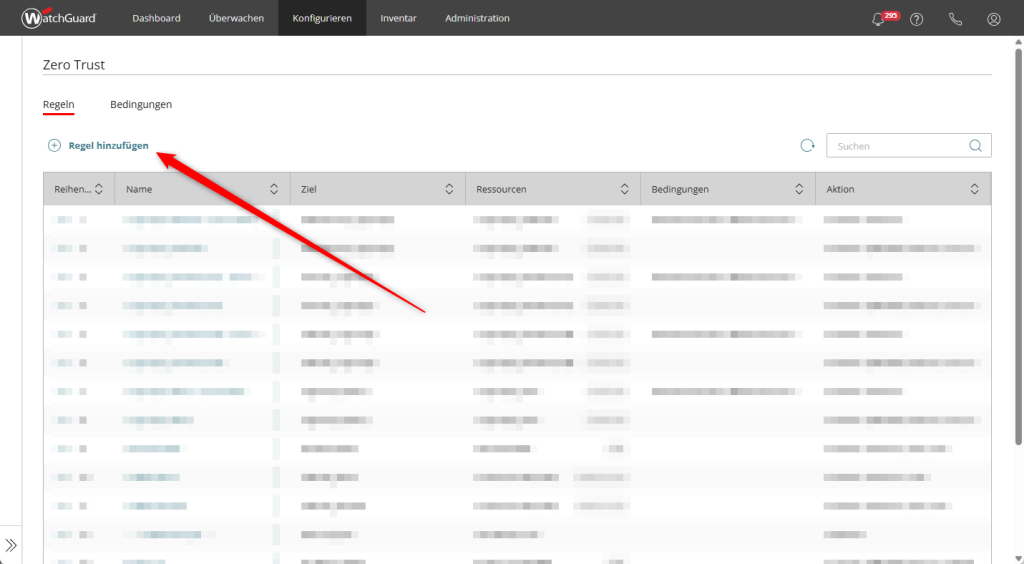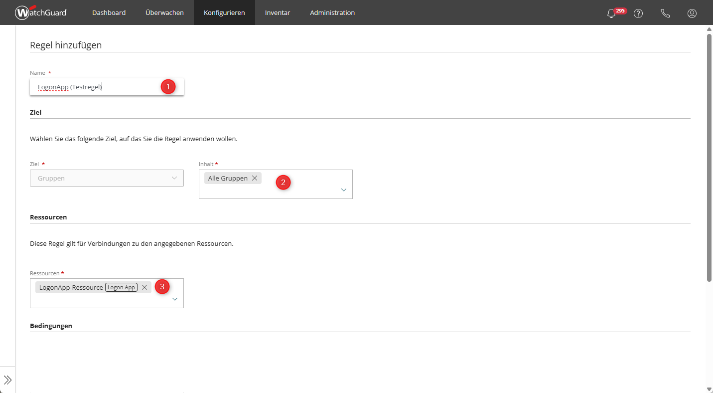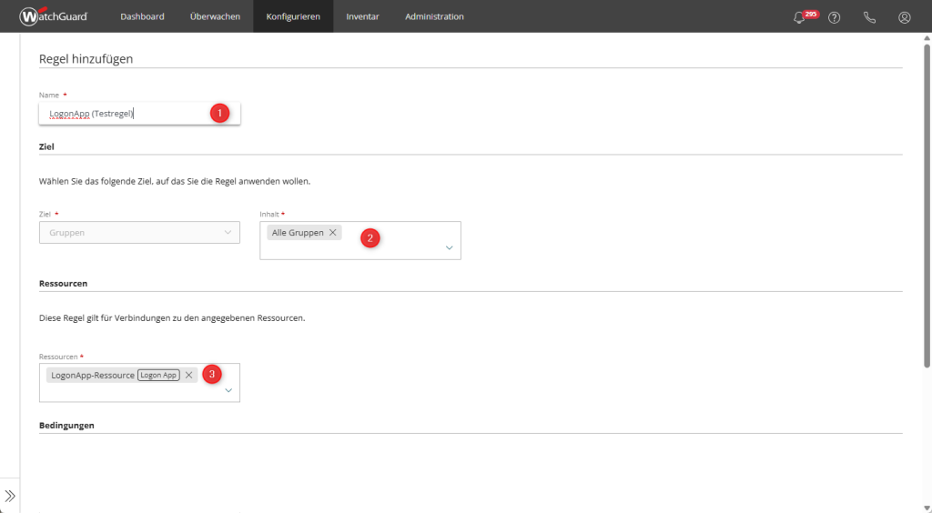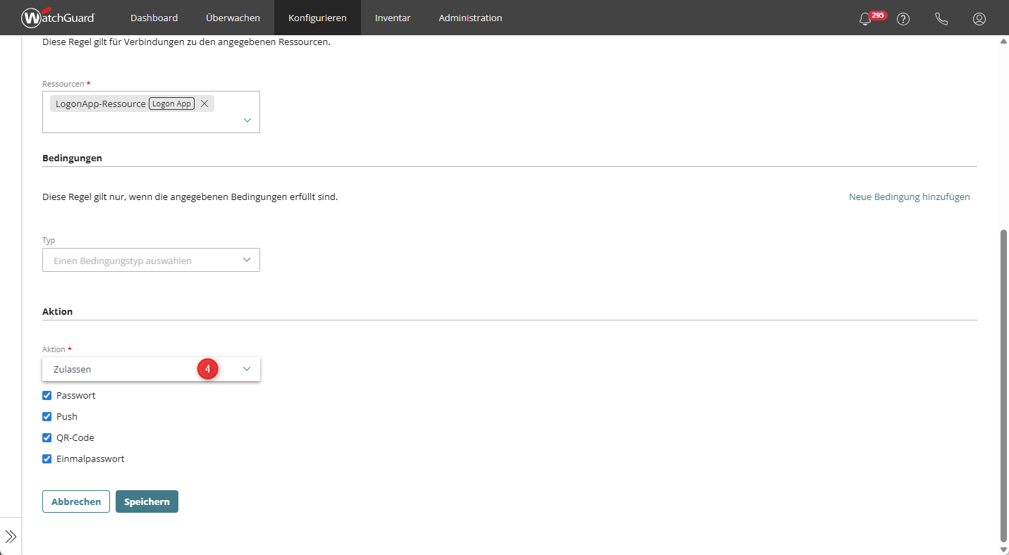 Der zweite Schritt ist eine Regel zu definieren, die besagt welche bekannten Benutzer bzw. Gruppen aus AuthPoint sich mit der Logon App anmelden dürfen. Im TOP-Menü Konfigurieren -> Zero-Trust gibt es ganz oben den Button „Regel hinzufügen“. Hier wird ein Name definiert (1), die Gruppe die Zugriff erhalten soll ausgewählt (2), die oben erstellte Ressource zugewiesen (3) und die Aktion „Zulassen“ (4) definiert mit den gewünschten Aktionen die zur Anmeldung zur Verfügung stehen sollen: