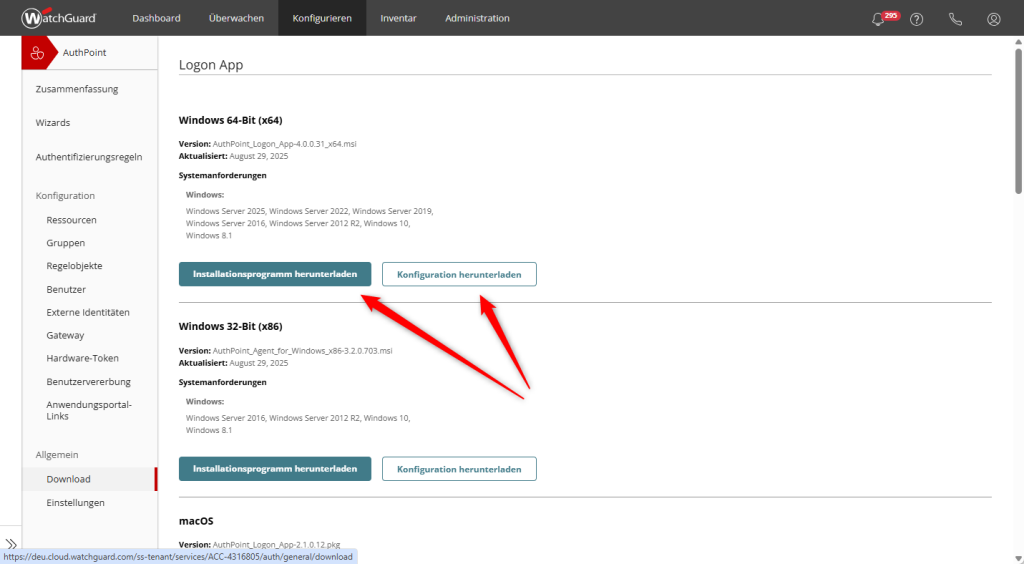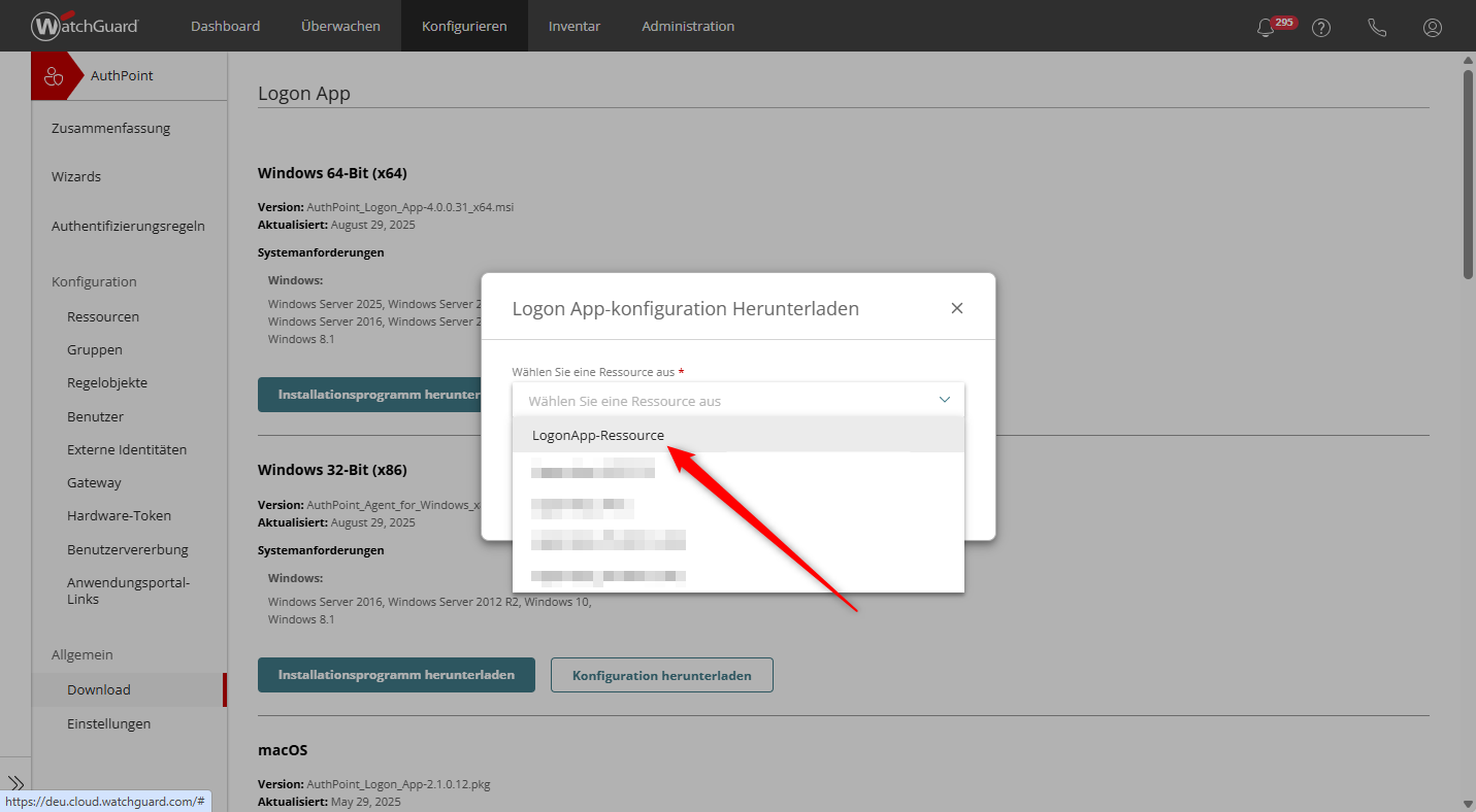 Der letzte Schritt in der WatchGuard Cloud ist das Herunterladen der Installationsdatei und der Konfiguration. Im TOP-Menü Konfigurieren -> AuthPoint -> Download findet man beides – gibt es mehrere unterschiedliche Logon App-Ressourcen dann wird bei „Konfiguration herunterladen“ gefragt welche heruntergeladen werden soll: