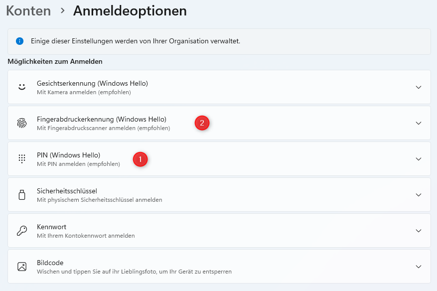 Daher sollte über die Windows-Einstellungen -> Konten -> Anmeldeoptionen als Erstes eine PIN für Windows Hello hinterlegt werden (1):